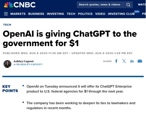 【环球网科技综合报道】8月7日消息,美国人工智能公司OpenAI近日宣布与美国政府中央采购部门——美国总务管理局达成合作协议。根据协议,自明年起,OpenAI将以每个联邦机构1美元的价格,向参与合作的联邦机构提供ChatGPT企业版服务。